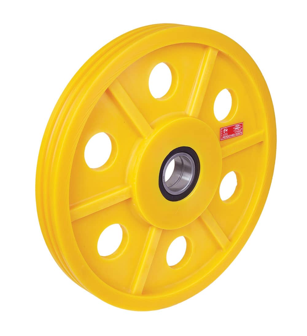 فلکه هیدرولیک پلی آمید جنس:mc nylon قطر:40cm تعداد شیار : 2 عدد تعداد بلبرینگ: 2 عدد KG چین طول شفت :15cm